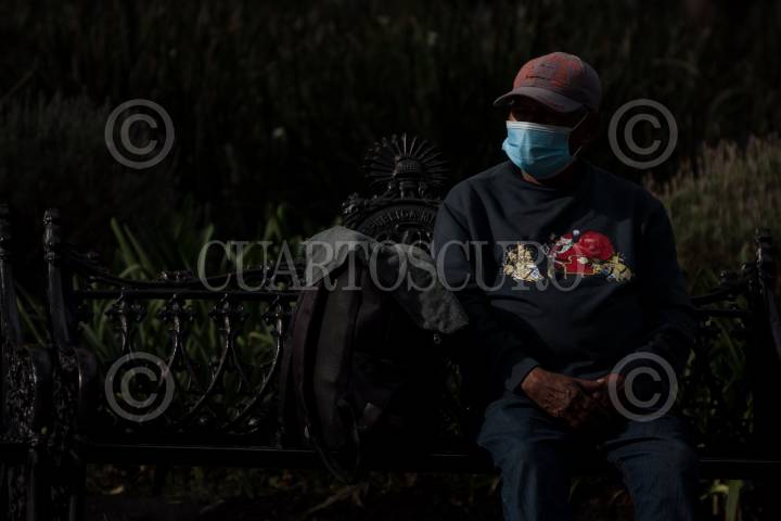 Un hombre acompañado de su mochila permanece sentado en una de las bancas de la Alameda central.