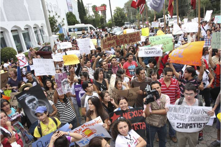 CUERNAVACA, MORELOS, 25MAYO2012.- Alrededor 700 estudiantes simpatizantes con el movimiento “yo soy 132” pertenecientes a diferentes centros universitarios, acordaron realizar un mitin en el Hotel Villa Bejar donde se realizaba un evento de la fundación Colosio, posteriormente se movilizaron por segunda ocasión en esta semana a manifestarse frente a las instalaciones de Televisa Morelos. FOTO: ALMA LAFAYET /CUARTOSCURO.COM