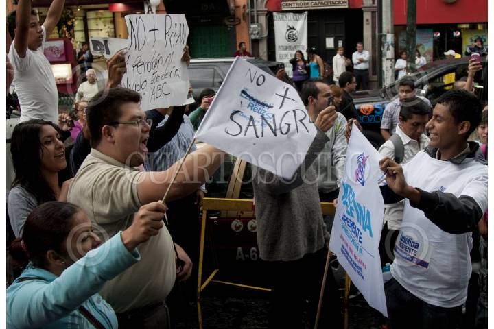 MÉXICO, D.F., 04JUNIO2012.- Participantes del movimiento #Yo soy 132, se manifestaron durante el mitín que realizaba la candidata por el PAN a la presidencia de la república, Josefina Vázquez Mota. Con pancartas y consignas como "Ni perdón, ni olvido, guardería ABC", "No + sangre" y "no otros 60 mil muertos", los jóvenes fueron encarados por simpatizantes panistas. FOTO: ADOLFO VLADIMIR /CUARTOSCURO.COM