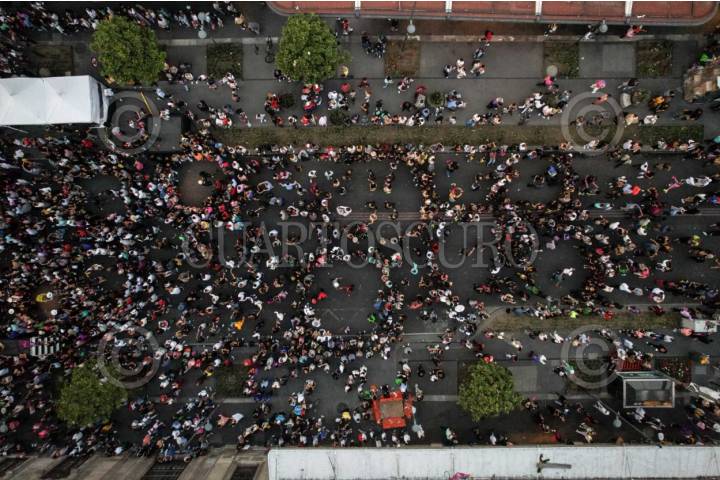CIUDAD DE MÉXICO, 01JULIO2025.- Vista paorámica en el cruce de Eje 1 Norte y Av. del Trabajo, en Tepito, se realizó un homenaje a Héctor Lavoe, convocado por la Secretaría de Cultura capitalina. Participaron sonideros y clubes de baile en una coreografía colectiva titulada “La Salsa Más Grande”, con música del cantante. El acto formó parte de las actividades relacionadas con el patrimonio cultural sonidero de la Ciudad de México. FOTO: TOMÁS PÉREZ DE LA CRUZ/CUARTOSCURO.COM