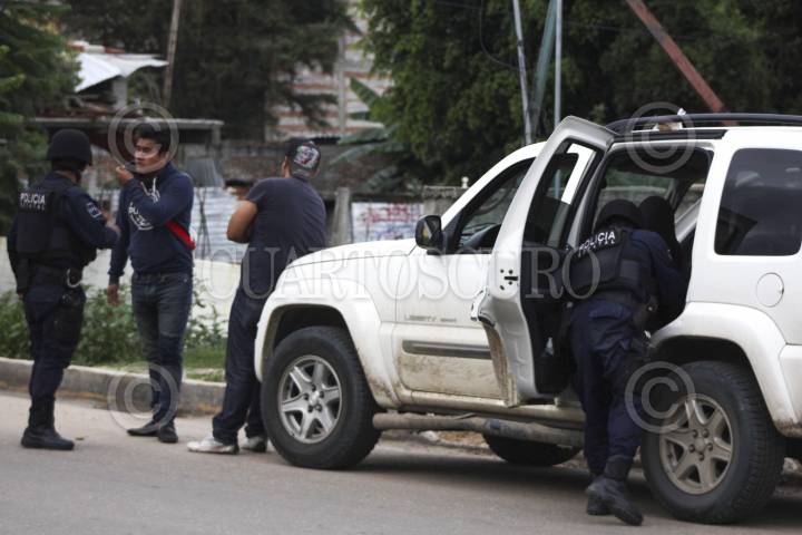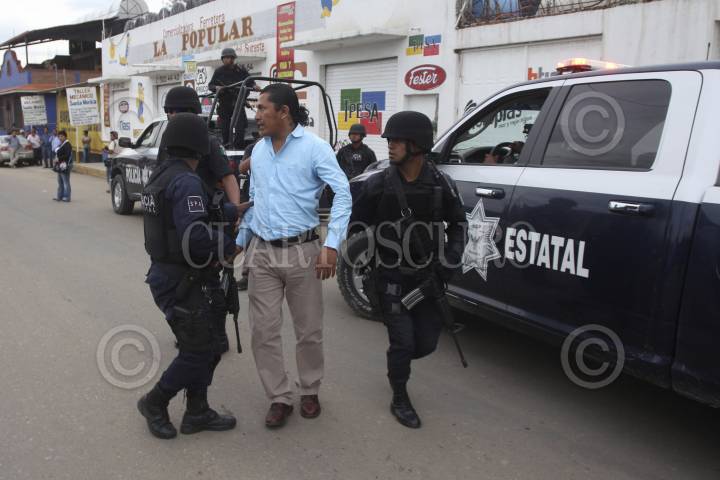 SANTA LUCÍA DEL CAMINO, OAXACA, 07JULIO2013.- Policías Estatales detuvieron a Alejandro Caanseco Núñez alias "El Perro", quien fue reportado por los vecinos del municipio de Santa Lucía del Camino, esto luego de que se cerraran las casillas en dicha localidad, de acuerdo con los elementos se recibió una llamada alertando a las autoridades de un grupo sospechoso de jóvenes quienes se reunieron a un costado de una casilla en la calle de Hornos, luego de una revisión, los uniformados detuvieron a Canseco Núñez y a tres jóvenes más, dejando en libertad a más de 10. FOTO: ARTURO PÉREZ ALFONSO/CUARTOSCURO.COM