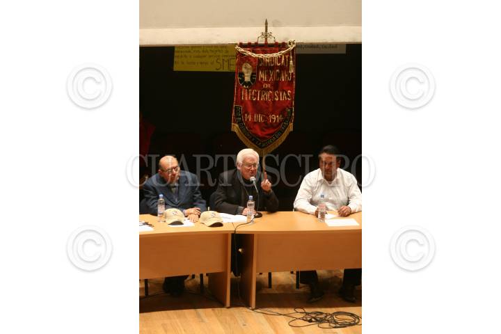 MÉXICO, D.F., 13NOVIEMBRE2009.- Los obispos, Samuel Ruiz, Raúl Vera , Martín Esparza secretario general del Sindicato Mexicano de Electricistas (SME) , durante la asamblea informativa que sostuvieron esta tarde con electricistas en las instalaciones del sindicato. FOTO: SASHENKA GUTIÉRREZ/CUARTOSCURO.COM