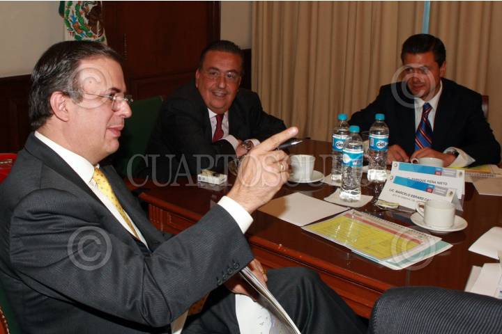 MÉXICO, D.F., 07MAYO2010.- Marcelo Ebrard, Jefe de Gobierno Capitalino, junto a Fernando Gomez Mont, Secretario de gobernación y Enrique Peña Nieto, Gobernador del estado de México, durante la reunión que sostuvieron para revisar los avances en el programa de obras de emergencia en materia de drenaje, las cuales tienen como objetivo disminuir la vulnerabilidad y riegos de inundaciones severas en el Valle de México, ante la próxima temporada de lluvias. FOTO: CUARTOSCURO.COM