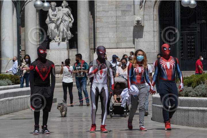 Jóvenes disfrazados de "Spiderman" caminan en la explanada del Palacio de Bellas Artes.