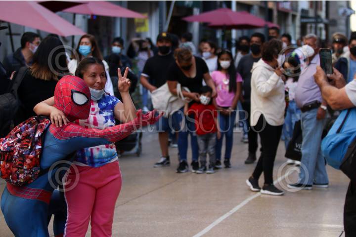 El personaje del superhéroe Spiderman se toma una fotografía acompañado de una mujer en la calle de Madero, en el Centro Histórico.