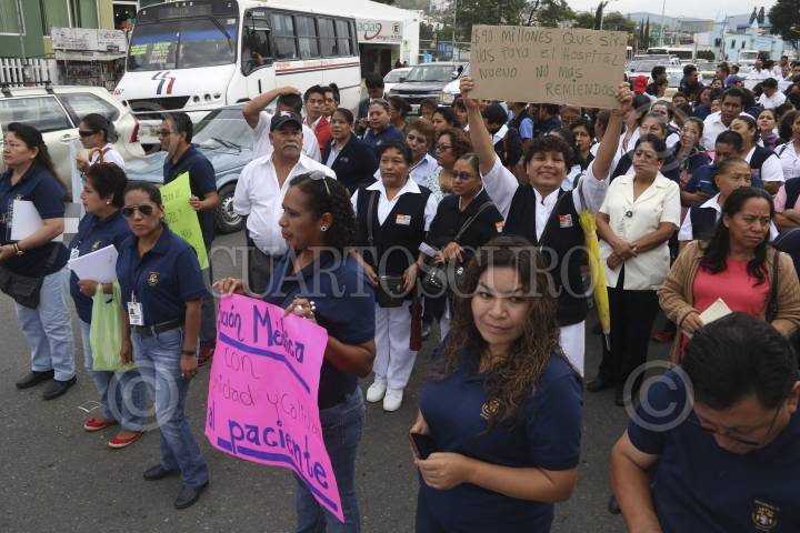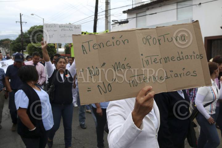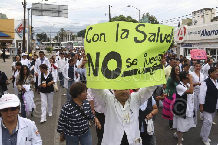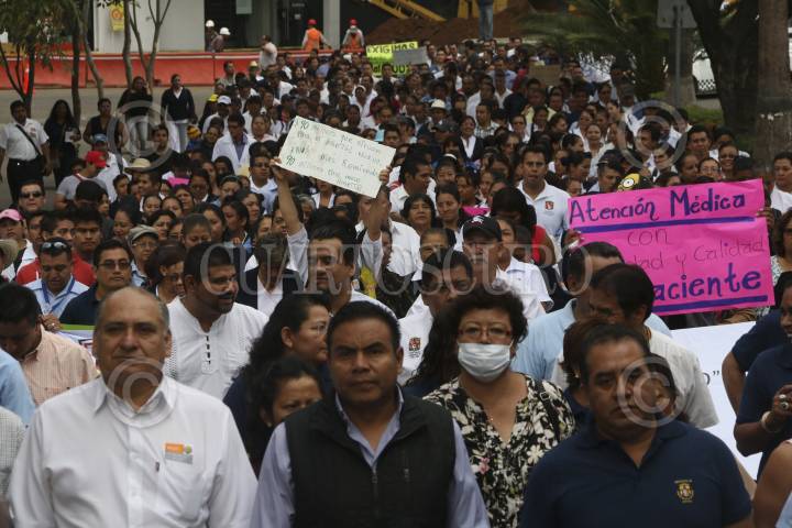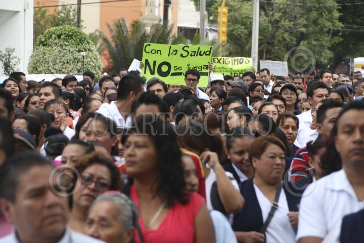 OAXACA, OAXACA, 27MAYO2015.- Integrantes de la sección 35 del Sindicato Nacional de los Trabajadores de la Secretaría de Salud (SNTSSA) marcharon la mañana de este miércoles para exigir el cumplimiento de los acuerdos establecidos con los 50 nosocomios y más de mil unidades médicas de todo el estado, ya que aún cuando han se han firmado acuerdos, estos no se han cumplido, lo que ha provocado que no se haya levantado el paro de labores. FOTO: ARTURO PÉREZ ALFONSO /CUARTOSCURO.COM