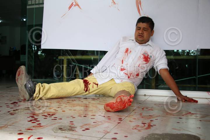 OAXACA, OAXACA, 27AGOSTO2018.- El cirujano dentista, Romulo Alberto Palacios Trejo trabajador de la Secretaría de Salud del estado se desangró este lunes frente a las oficinas de la dirección de Recursos Humanos de esa dependencia, lo anterior debido a que se han negado a brindarle la seguridad social pese a que firmaron dicho compromiso, esto derivado de que sufrió un accidente de trabajo lo que ocasionó perdiera dos dedos el pie izquierdo. Además acusó está siendo hostigado para que renuncie a su puesto en la clínica de salud del municipio de San Antonio de la Cal en donde ya se le impide el acceso por parte de policías municipales. FOTO: ARTURO PÉREZ ALFONSO/ CUARTOSCURO.COM