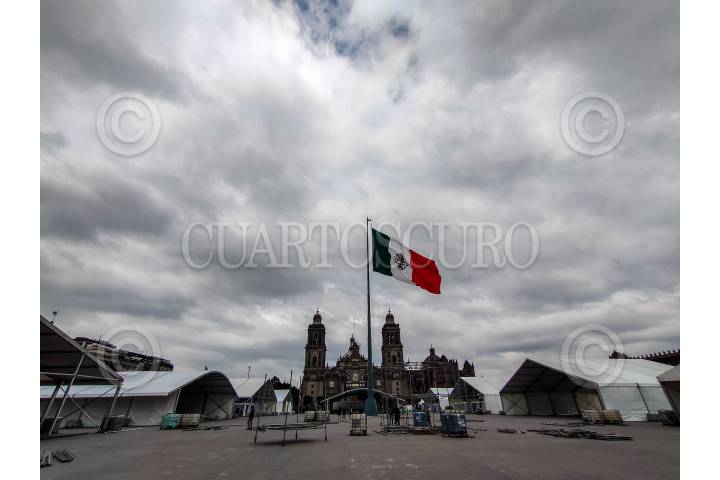 CIUDAD DE MÉXICO, 08OCTUBRE2023.- Trabajadores se encuentran colocado los stands de la Feria Internacional del Libro en la plancha del zócalo. FOTO: MOISÉS PABLO/CUARTOSCURO.COM