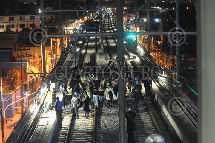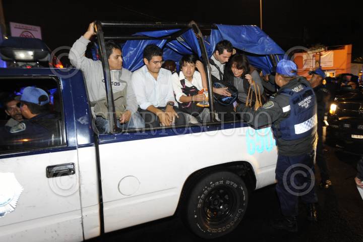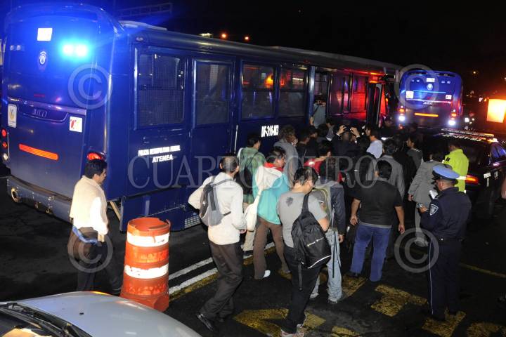 MÉXICO D. F., 13MAYO2015.- Fallas en el sistema de vías del transporte colectivo metro, provoco que se suspendiera el servicio minutos antes de lo normal. Ocasionando, que los usuarios de este servicio desesperaran ante su reanudación, negándose a abandonar los andenes de la estación Buenavista. Por este motivo, la SSPDF, implemento un operativo como servicio alterno, que traslado a los pasajeros hasta los destinos de las estaciones que recorren las líneas 8 y B, trasladando aproximadamente a 700 usuarios alrededor de las 01:00 horas. FOTO: LUIS CARBAYO /CUARTOSCURO.COM