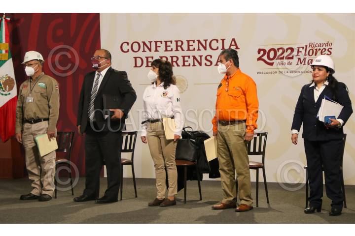 Victoria Arredondo Lami, Ricardo Aldana Prieto, Daniel Aranda Padilla, María Cristina Alonso García, y José Luis Cabrera Raga, son los primeros cinco candidatos de 25 que se presentaron a la mañanera para dar a conocer su plataforma de gestión con miras a presidir el Sindicato de Trabajadores Petroleros de la República Mexicana (STPRM). En la imagen los acompaña el Presidente de México, Andrés Manuel López Obrador.
