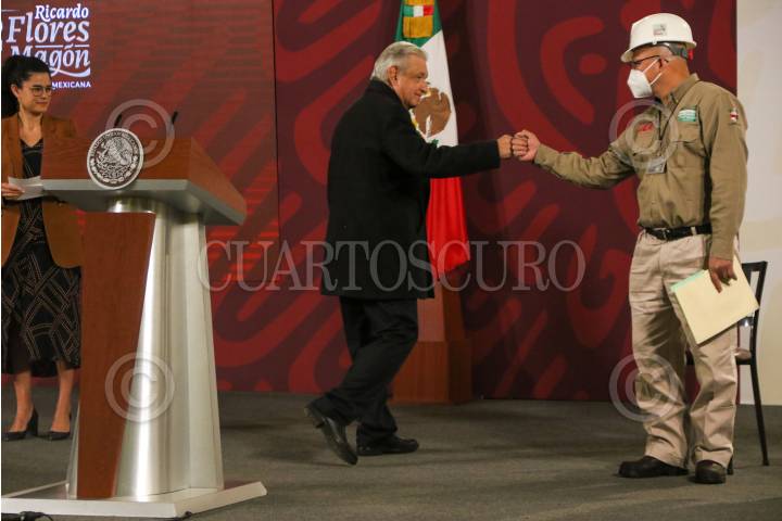 Andrés Manuel López Obrador, Presidente de México, pasa por detrás de Ricardo Aldana, actual tesorero del STPRM, quien busca presidir la secretaría general de este organismo.