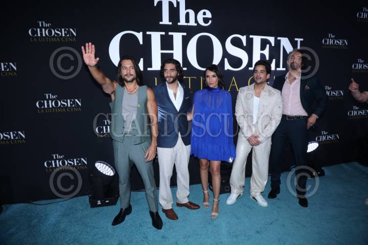 CIUDAD DE MÉXICO, 02ABRIL2025. Parte del elenco que visitó nuestro país, Shahar Isaac, Luke Dimyan, Vanessa Benavente, Paras Patel y Abe Bueno-Jallad a su llegada a la alfombra turquesa por el estreno para Latinoamérica de la serie “The Chosen: La ultima cena”, que llega a su quinta temporada, transmitiéndose por plataformas de streaming. FOTO: EDGAR NEGRETE LIRA/CUARTOSCURO.COM