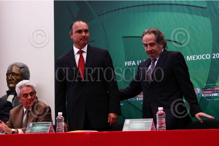 QUERÉTARO, QUERÉTARO, 03FEBRERO2011.- Justino Compean, presidente del Comité Organizador del Mundial Sub-17; José Calzada, Gobernador del estado y Decio de María, Miembro del Comité Organizador del Mundial Sub-17; durante la ceremonia donde se anunció al estado de Queretaro como una de las sedes donde se llevará acabo el Mundial Sub-17 del 18 de junio al 10 de julio. FOTO: MISAEL VALTIERRA/CUARTOSCURO.COM