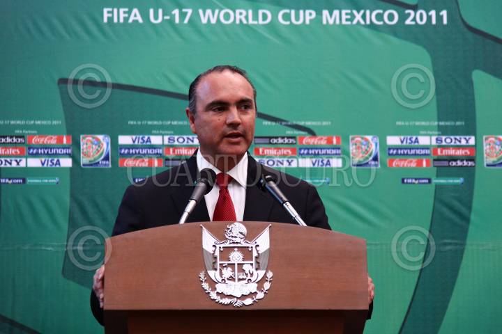 QUERÉTARO, QUERÉTARO, 03FEBRERO2011.- José Calzada, Gobernador del estado; durante la ceremonia donde se anunció al estado de Queretaro como una de las sedes donde se llevará acabo el Mundial Sub-17 del 18 de junio al 10 de julio. FOTO: MISAEL VALTIERRA/CUARTOSCURO.COM