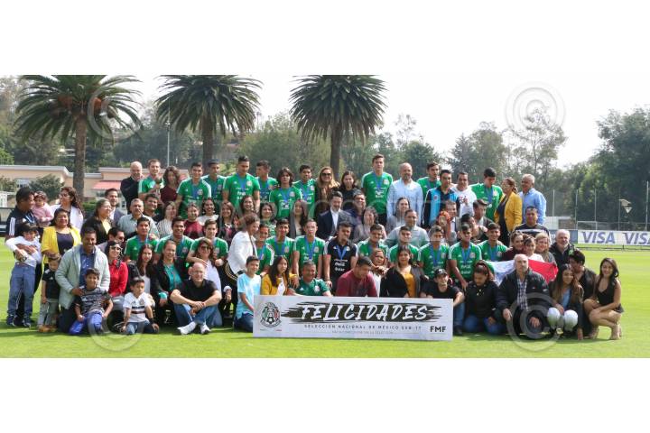 CIUDAD DE MÉXICO, 20NOVIEMBRE2019.- Marco Ruiz, director técnico Selección Sub-17, Yon de Luisa, presidente de la Federación Mexicana de Fútbol, Gerardo Torrado, director general deportivo y el equipo de la Sección Mexicana Sub-17 Subcampeona del Mundial de Brasil 2019, durante la toma de la fotografía oficial acompañados de sus familiares. FOTO: ROGELIO MORALES /CUARTOSCURO.COM