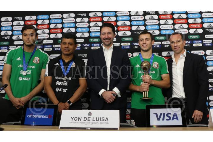 CIUDAD DE MÉXICO, 20NOVIEMBRE2019.- Eduardo Garcia, seleccionado nacional, Marco Ruiz, director técnico Selección Sub-17, Yon de Luisa, presidente de la Federación Mexicana de Fútbol, Gerardo Torrado, director general deportivo y Eugenio Pizzuto, seleccionado nacional, durante la conferencia de prensa en donde abordaron el tema del futuro del técnico y de los jugadores subcampeones del mundo. FOTO: ROGELIO MORALES /CUARTOSCURO.COM