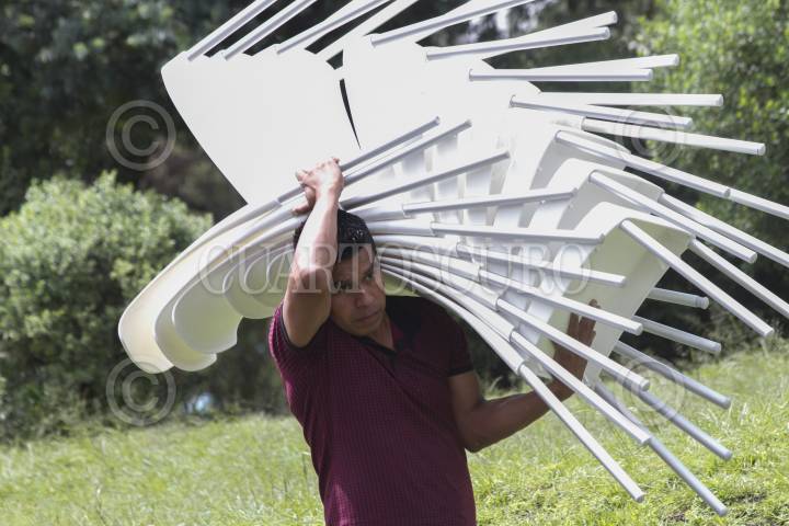 CIUDAD DE MÉXICO, 06SEPTIEMBRE2016.- Un trabajador carga sillas en el evento en donde se lanzó la Estrategia de Resiliencia CDMX, en el Cárcamo de Dolores en el Bosque de Chapultepec. FOTO: MOISÉS PABLO /CUARTOSCURO.COM