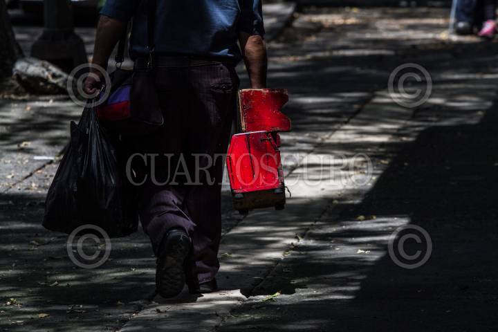 CIUDAD DE MÉXICO, 25JULIO2018.- Un bolero con su tradicional cajón rojo busca clientes en las calles de la colonia Condesa. FOTO: MOISÉS PABLO /CUARTOSCURO.COM
