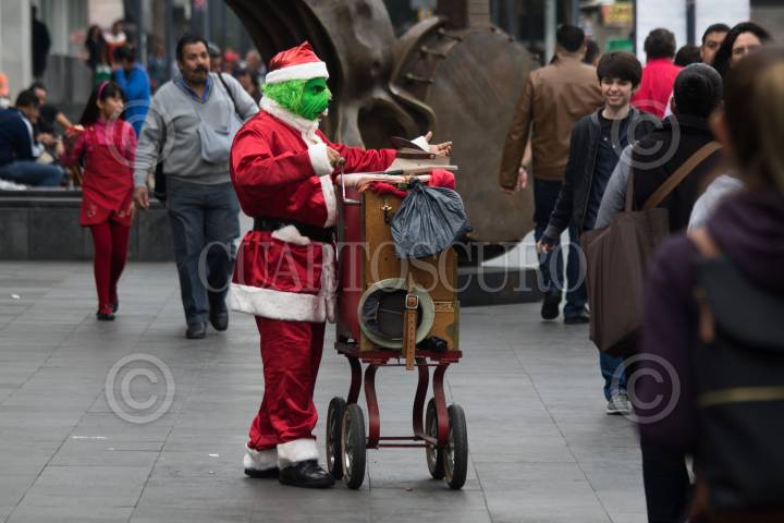 CIUDAD DE MÉXICO, 28DICIEMBRE2018.- Un organillero caracterizado de el Grinch llena el ambiente con sus notas musicales en avenida Juárez a cambio de unas monedas que ayuden a su economía. FOTO: MOISÉS PABLO /CUARTOSCURO.COM