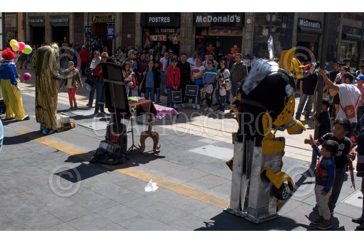 CIUDAD DE MÉXICO, 10FEBRERO2019.- Un payaso, una estatua viviente, un mago y una botarga de un transformer ofrecen individualmente su oferta de entretenimiento en la calle de Madero, muchos jóvenes han encontrando de esta manera su forma de ganarse la vida. FOTO: MOISÉS PABLO /CUARTOSCURO.COM