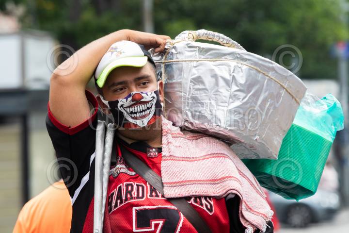 Un joven con cubrebocas de payaso carga sus tacos de canasta que ofrece en la Merced.