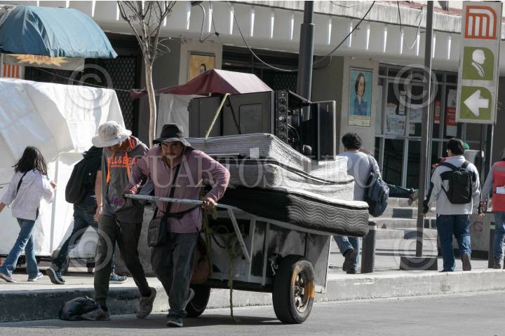 Vendedores de café y pan regresan a casa tras terminar su jornada de trabajo matutino.