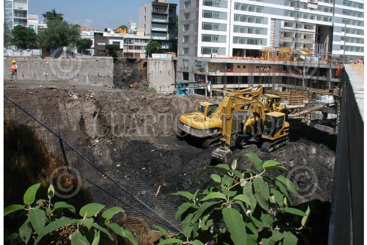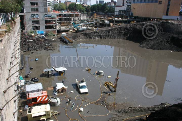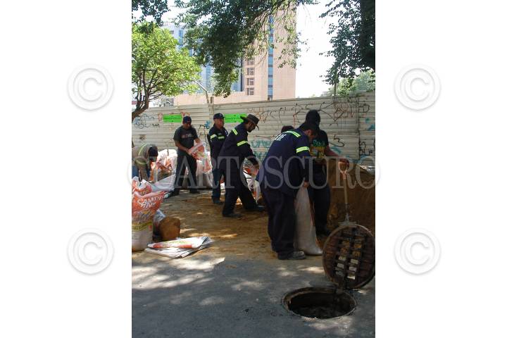 MÉXICO, D.F., 14MAYO2009.- Personal de obras del Gobierno del Distrito Federal, comenzaron labores para limpiar el terreno en el que se registro el hundimiento de tierra el día de ayer, debido al reblandecimiento del subsuelo por las primeras lluvias que se han registrado en las ultimas horas. Ya se labora para el rescate de algunos vehículos y mobiliario que ha quedado barado en el lugar a causa de el agua acumulada, posteriormente se harán labores de relleno con tierra que se pone en costales para evitar que el lugar se siga deslavando. Estas obras se llevan acabo en la calle Dakota de la colonia Napoles, perímetro de la Delegación Benito Juárez. FOTO: LUIS CARBAYO/CUARTOSCURO.COM