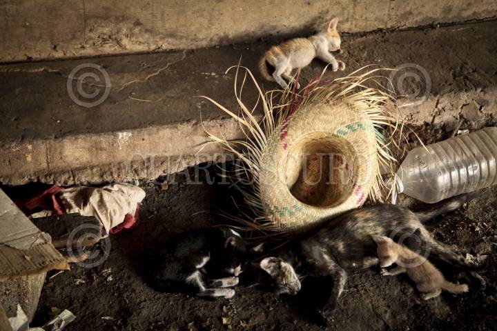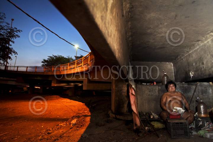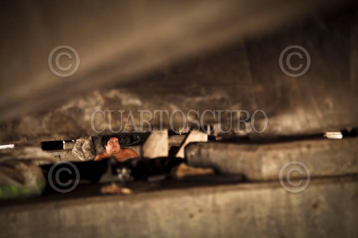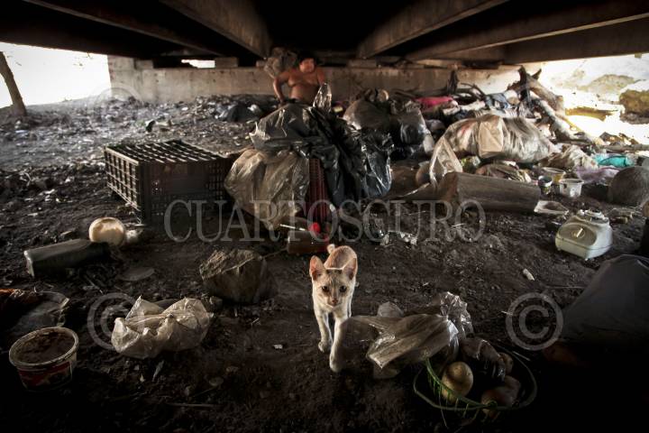 CULIACAN, SINALOA, 05JULIO2013: Santos Venegas Castañeda de 45 años de edad, tiene su hogar bajo el puente que cruza el rio Tamazula a un costado del puente Negro. Así como Venegas alrededor de 10 personas más, viven en estas condiciones de pobreza extrema; Santos lleva 3 años viviendo así debido a que su papá perdió la vida y con ello el hogar, no tiene esposa ni hijos solo un hermano que le ayuda con la comida que de igual manera vive abajo del puente. La compañía de Santos es un perro que lleva por nombre Negro, una paloma que salvo y alrededor de 6 gatos, su pasatiempo es leer la Biblia. FOTO: RASHIDE FRIAS /CUARTOSCURO.COM