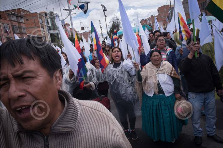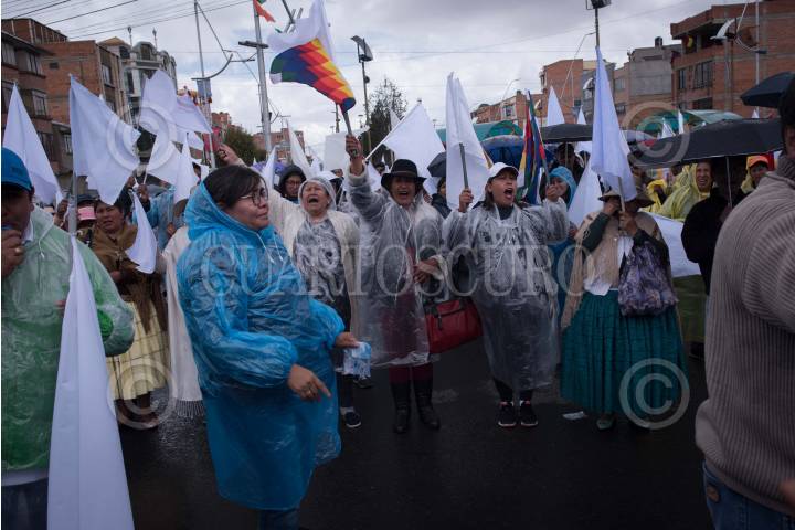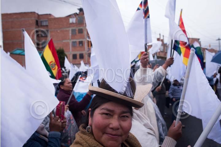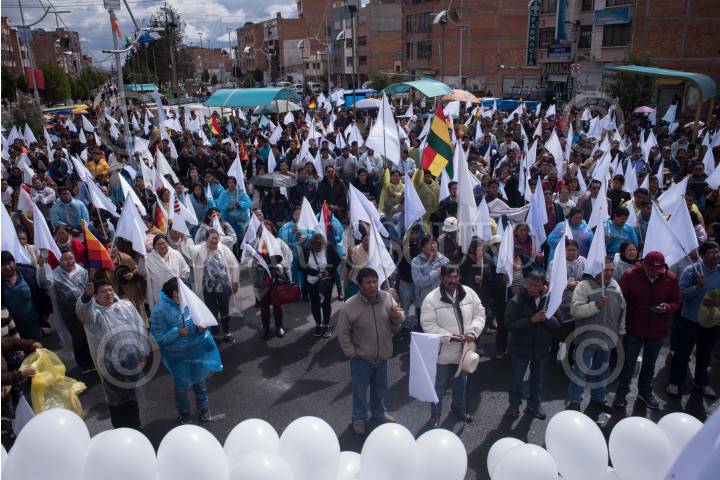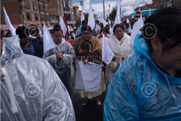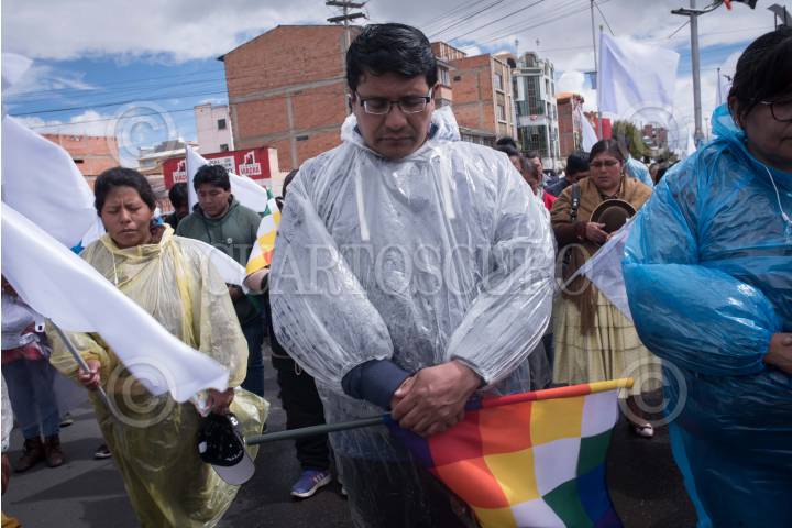 LA PAZ, BOLIVIA, 23NOVIEMBRE2019.- Se realizó una concentración en la explanada del Obelisco de la ciudad de "El Alto", la cual colinda con la ciudad capital del país. La reunión, que congregó alrededor de 100 o 200 personas, se denominó "Marcha por La Paz"; quienes hicieron uso del estrado y los micrófonos aseguraron que se trataba de un acto cívico y a voluntad; estuvieron presentes organizaciones como el Consejo Nacional de Ayllus y Markas del Qullasuy y el Comité Cívico Pro Departamento La Paz. Los no más de doscientos asistentes entonaron plegarias al son de un pastor que hablaba dese la tarima con enjundia sobre el papel de Cristo y la oración en la huída del ex presidente Evo Morales. Lo anterior en un contexto en el cual el senado de Bolivia aprobó por unanimidad que se convocará a nuevas elecciones. FOTO: PEDRO ANZA /CUARTOSCURO.COM