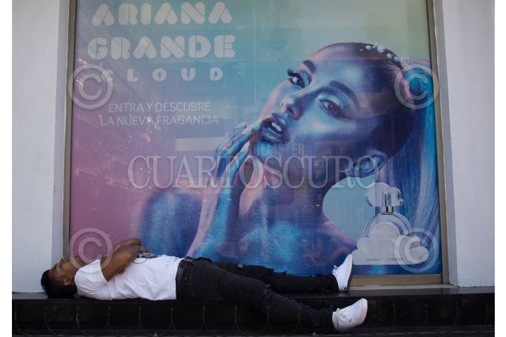 CIUDAD DE MÉXICO, 09JUNIO2019.- Un siesta a medio día bajo la mirada de la estrella del pop Ariana Grande, en avenida Juárez. FOTO: MOISÉS PABLO /CUARTOSCURO.COM