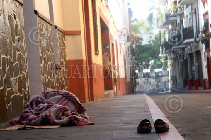 CUERNAVACA, MORELOS, 24SEPTIEMBRE2019.- Un indigente duerme envuelto en una cobija de cuadros en la acera de la calle Juan Ruíz Alarcón en el centro de la ciudad, la mañana de este día. FOTO: MARGARITO PÉREZ RETANA /CUARTOSCURO.COM