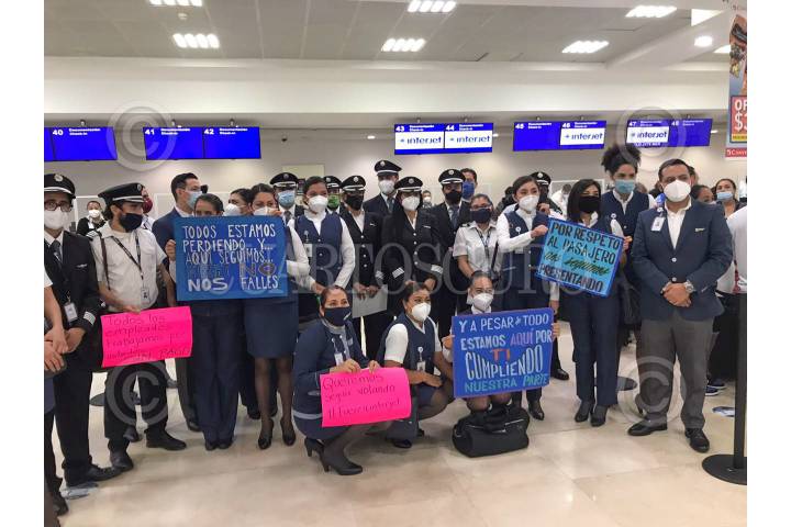 Empleados de Interjet, Cancún, posan con cubrebocas y carteles.