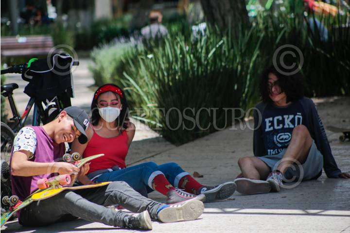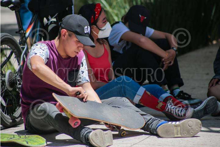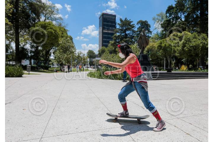 Algunos jóvenes practican suertes de skate en el Parque Cuauhtémoc Alameda Central.