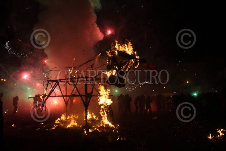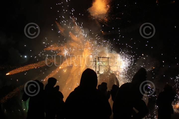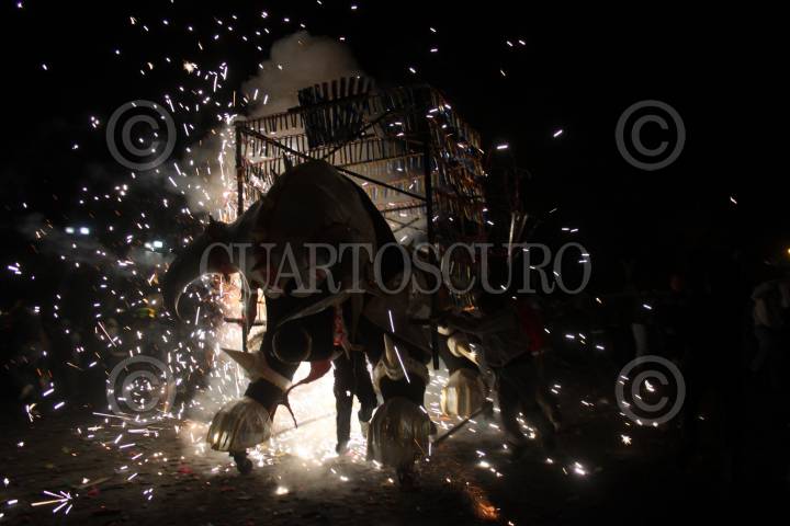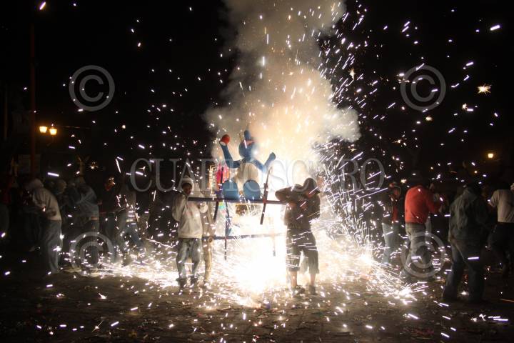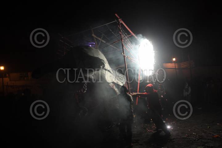 TULTEPEC, ESTADO DE MÉXICO 09MARZO2010.- Del 6 al 15 de Marzo se realiza en Tultepec la feria de la pirotécnia, teniedo diversas actividades relacionados con los juegos artificiales. La noche de ayer, los habitantes del lugar festejaron a San Juan de Dios, patrono de los pirotécnicos, por lo que fueron quemados más de cien “toritos” en una actividad llamada "pamplonada pirotecnica", donde cientos de jóvenes se dan cita en la en la plaza municipal para brincar alrededor de las luces de artificio que son expulsadas de los "toritos". Las personas que acuden a esta festividad suman los 100 mil visitantes. FOTO: SÁSHENKA GUTIÉRREZ/CUARTOSCURO.COM
