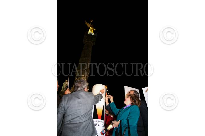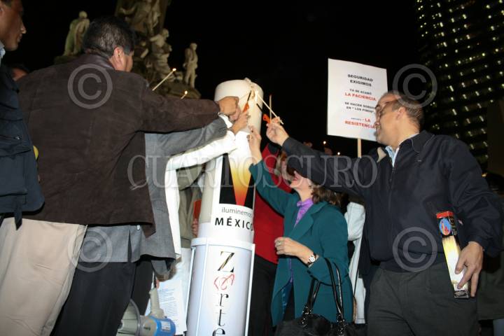 MÉXICO, D.F., 10DICIEMBRE2008.- El grupo iluminemos México encendio una vela gigante a las faldas de el Angel de la Independencia para conmemorar 100 dias e la marcha Iluminemos México, realizada del Ángel de la Independencia, en Paseo de la Reforma, al Zócalo capitalino, esta vela mide 2.10 metros de alto, 150 kilos de peso. FOTO: RICARDO CASTELAN/CUARTOSCURO.COM