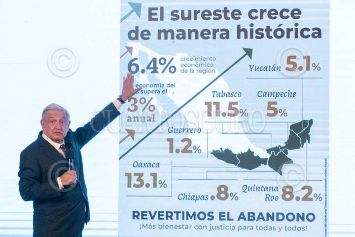 CIUDAD DE MÉXICO, 27NOVIEMBRE2023.- Andrés Manuel López Obrador, Presidente de México, muestra una gráfica en la que asegura que sureste creció de manera histórica en su periodo de gobierno, esto debido a la inversión del Tren Maya. FOTO: MOISÉS PABLO/CUARTOSCURO.COM