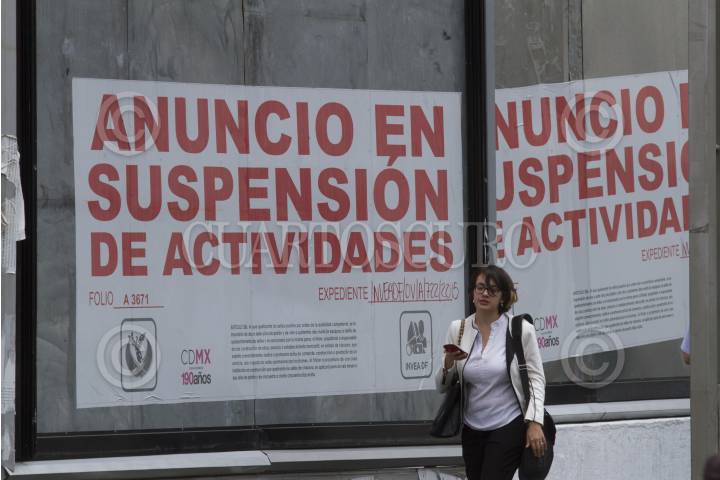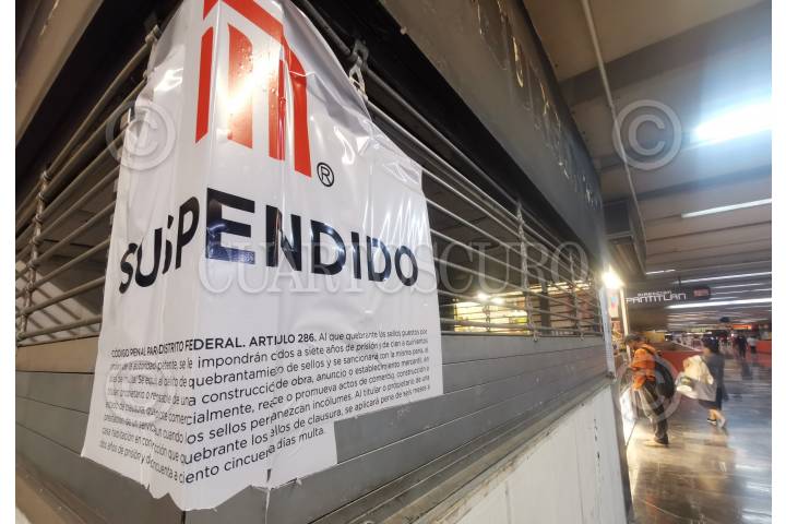 Un negocio de comida rápida muestra un sello de suspensión de actividades en la estación del metro Chilpancingo.