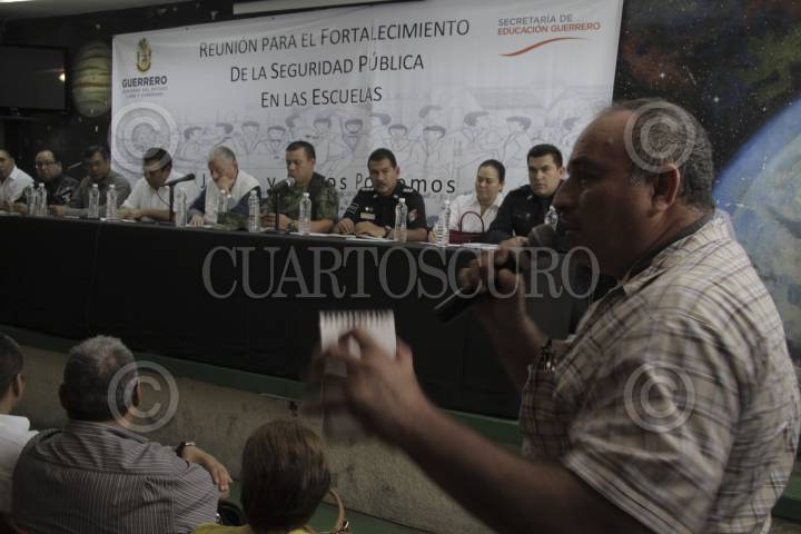 ACAPULCO, GUERRERO, 13ENERO2015.- En la secundaria técnica número uno, profesores pidieron a autoridades estatales y mandos federales que brinden seguridad, ya que, ante la falta de resultados en los operativos de vigilancia implementados en colonias de la periferia, se negaron a reanudar actividades hasta que existan garantías para retornar a los planteles. La mañana de este martes, el titular de la Secretaría de Educación Guerrero, Salvador Martínez Della Roca, encabezó la reunión institucional en el auditorio de la Técnica uno, ubicada en la avenida Ruiz Cortines. La población escolar ha disminuido hasta 50 por ciento, señalaron directores de planteles del Coloso. Los docentes exigieron un plan integral de reconstrucción del tejido social y no solamente dotar de más policías a las colonias conflictivas, entre las que señalaron la Emiliano Zapato, Renacimiento, Coloso, Pie de la Cuesta, Aguacaliente, “es todo Acapulco”, alertaron docentes. FOTO: BERNANDINO HERNÁNDEZ /CUARTOSCURO.COM