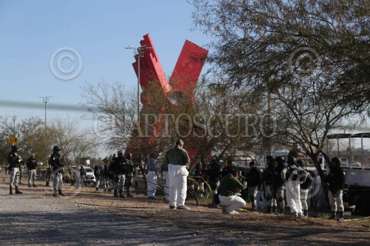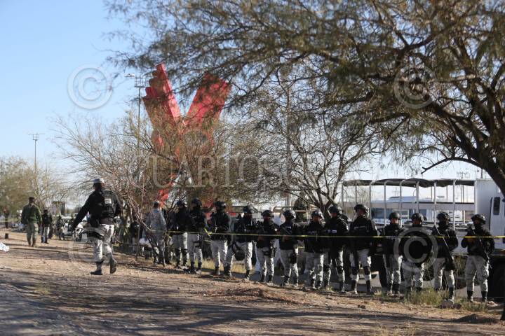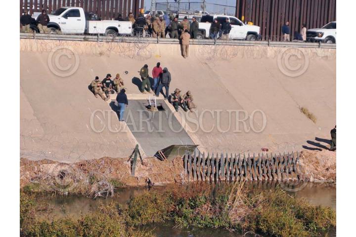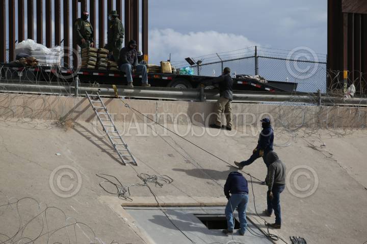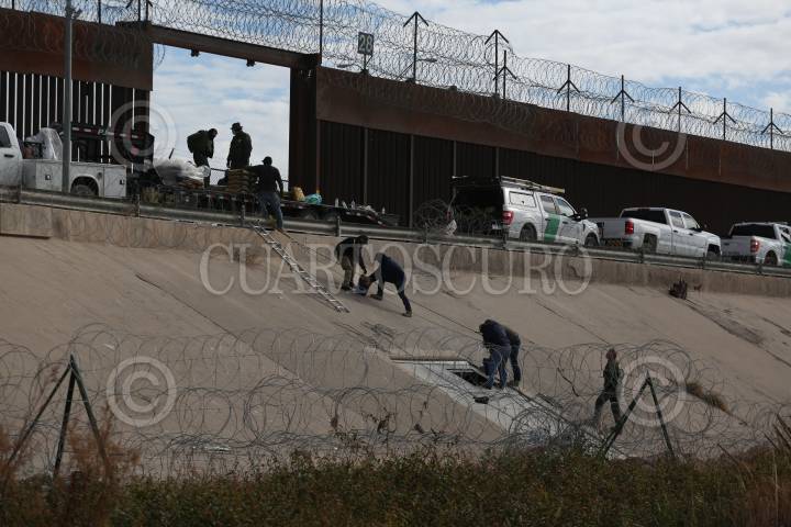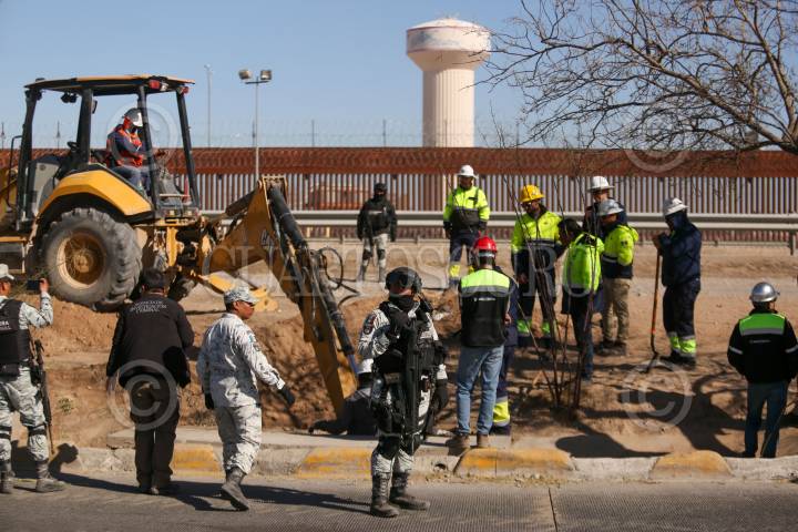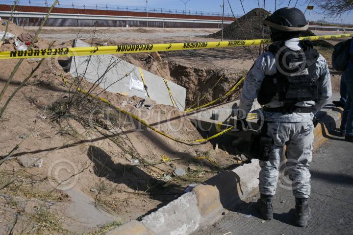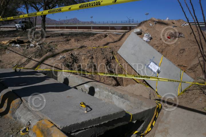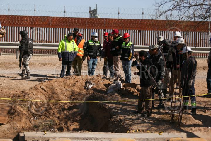 CIUDAD JUÁREZ, CHIHUAHUA, 27ENERO2025.- Autoridades mexicanas y estadounidenses iniciaron trabajos para sellar un túnel clandestino utilizado para el cruce ilegal de personas hacia EE.UU. El túnel, de más de 300 metros, fue detectado el 10 de enero y ahora se está cerrando para evitar su uso futuro. Las labores fueron suspendidas temporalmente y se reanudarán mañana. La zona sigue resguardada por la Guardia Nacional. FOTO: CARLOS SÁNCHEZ COLUNGA/CUARTOSCURO.COM