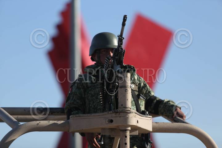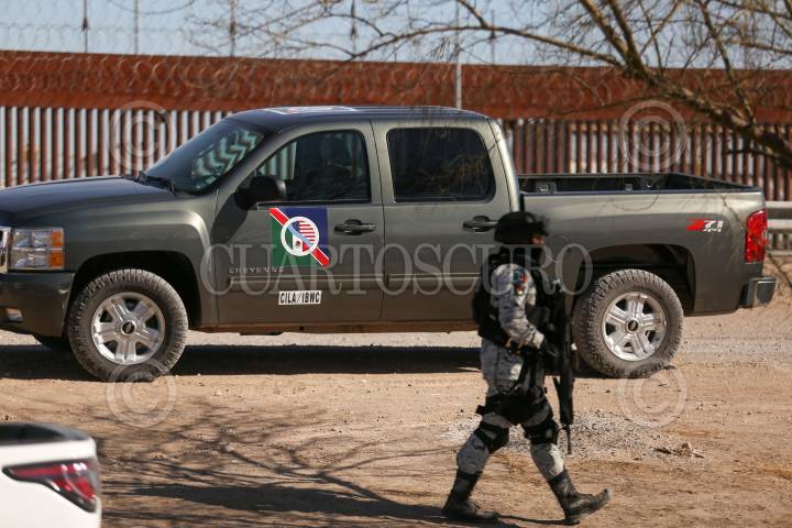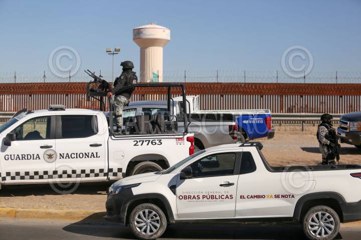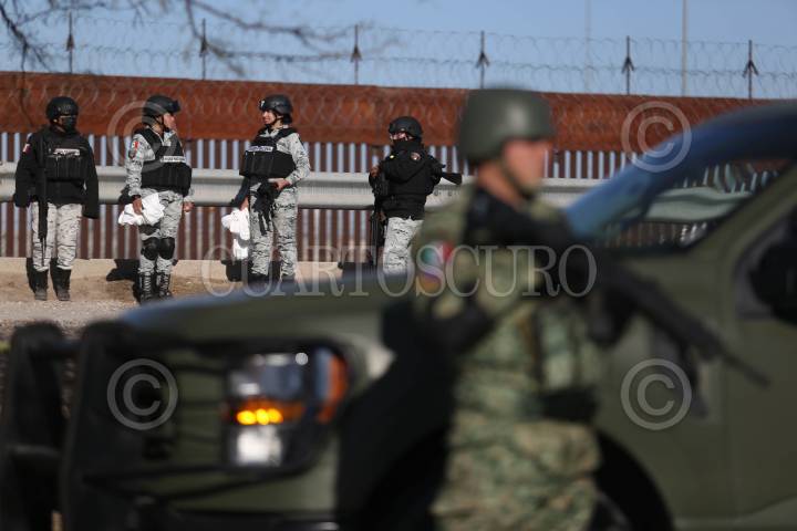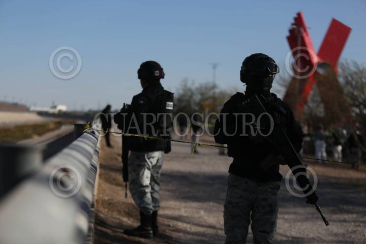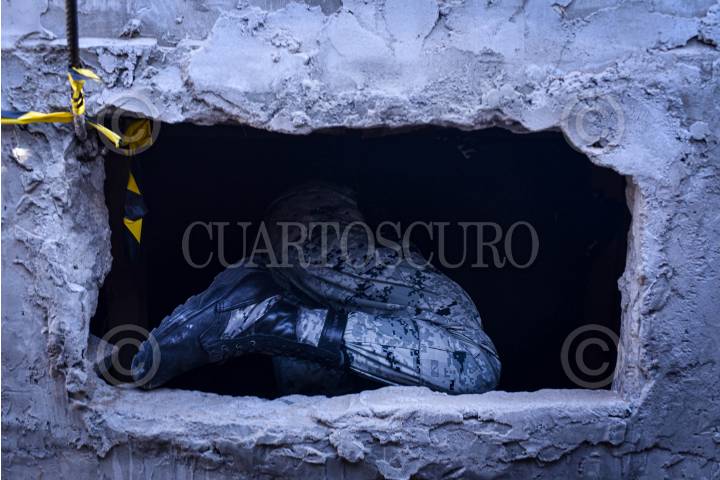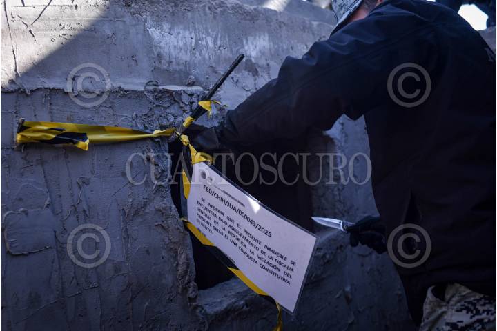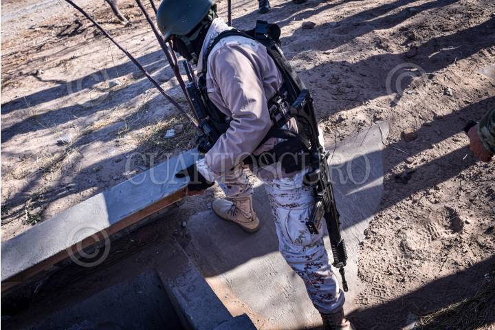 CIUDAD JUÁREZ, CHIHUAHUA, 18ENERO2025.- Personal de la Guardia Nacional (GN) resguardan la entrada principal al túnel clandestino que conectaba Ciudad Juárez con El Paso, Texas, el cual era presuntamente utilizados para el tráfico de migrantes y droga. FOTO: PEDRO ANZA /CUARTOSCURO.COM