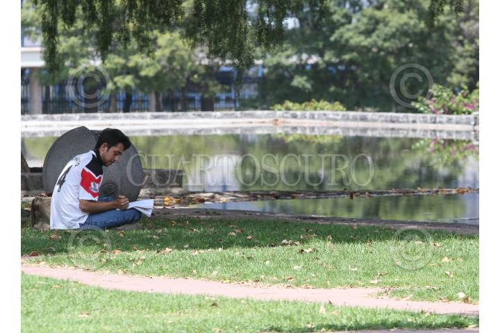 Joven toma notas en cuaderno en las áreas verdes de Ciudad Universitaria.