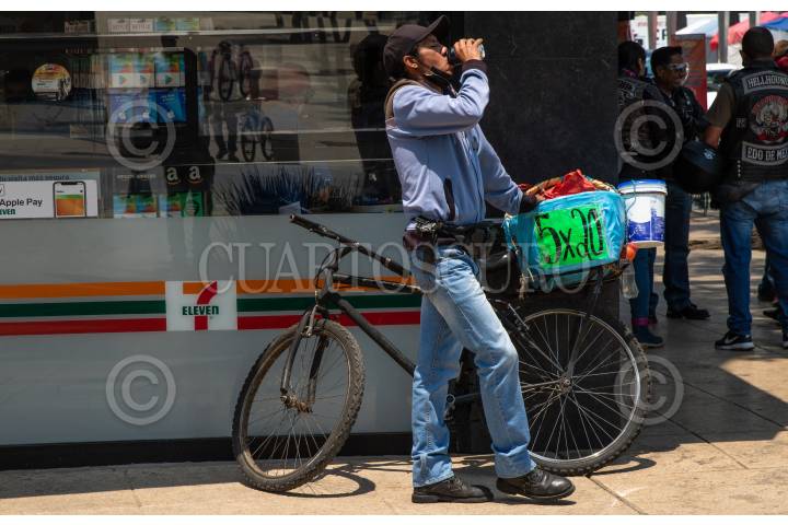 Un vendedor de tacos de canastas se toma un refresco para mitigar el calor.