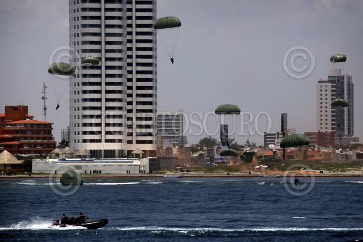 VERACRUZ, VERACRUZ., 29MAYO2012.- Elementos de la Secretaría de Marina Armada de México realizaron una demostración táctica previa a la que habrá de realizarse el 1 de Junio en conmemoración al Día de la Marina, en donde estará presente el presidente de la República, Felipe Calderón Hinojosa. La operación cuenta con diversas embarcaciones, aeronaves, vehículos terrestres y personal adiestrado en zona de combate. FOTO: FÉLIX MÁRQUEZ /CUARTOSCURO.COM