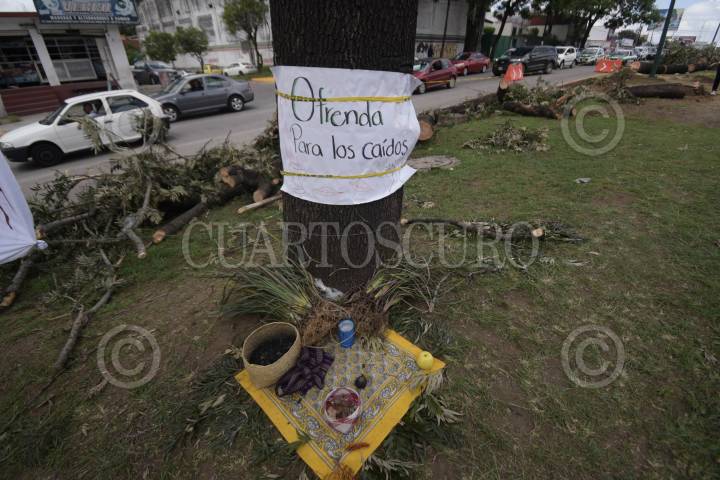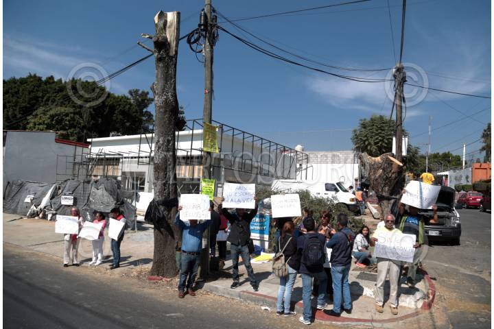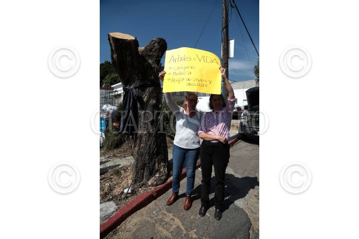 CUERNAVACA, MORELOS, 13DICIEMBRE2017.- Esta mañana activistas ambientales protestaron por la tala de dos jacarandas y un fresno de mas de 30 años de vida plantados en la esquina que forman las calles Aurora y Paseo del Conquistador. La directora de la organización Guardianes de los Arboles, Flora Guerrero, denuncio que los arboles fueron talados, sin permiso de las autoridades municipales, por trabajadores de la ayudantía de Ocotepec donde se construye una farmacia. Exigen los ambientalistas que se retiren los árboles dañados y que sean restituidos por especies mas adecuadas a la banqueta. FOTO: MARGARITO PÉREZ RETANA /CUARTOSCURO.COM