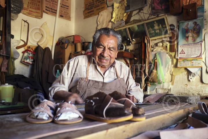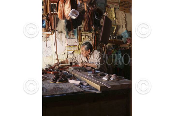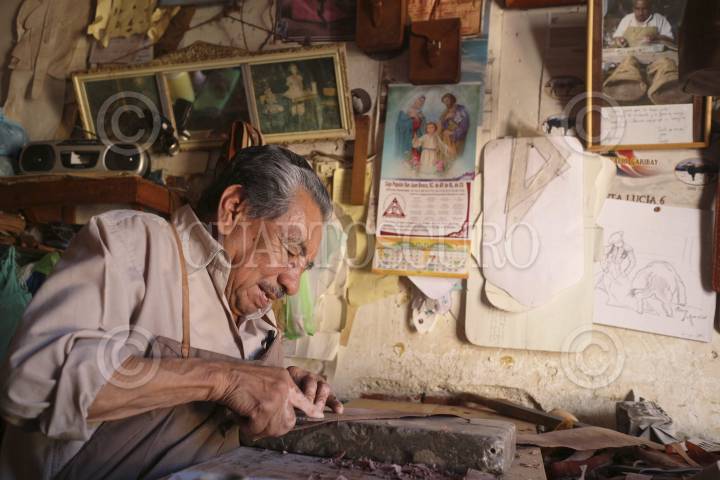 SAN CRISTOBAL DE LAS CASAS, CHIAPAS, 21ENERO2014.- Don Augusto Burgeti tiene 80 años y mas de 60 trabajando en el oficio de talabartería, unas de las artesanías sobresalientes de esta ciudad, que consiste en fabricar artículos de cuero y es una arte que se hereda por generaciones. Acompañado con con su antigua maquina de coser, fabrica todo tipo de artículos como bolsas, cinturones y zapatos, mochilas, billeteras etc. FOTO: ELIZABETH RUIZ /CAURTOSCURO.COM
