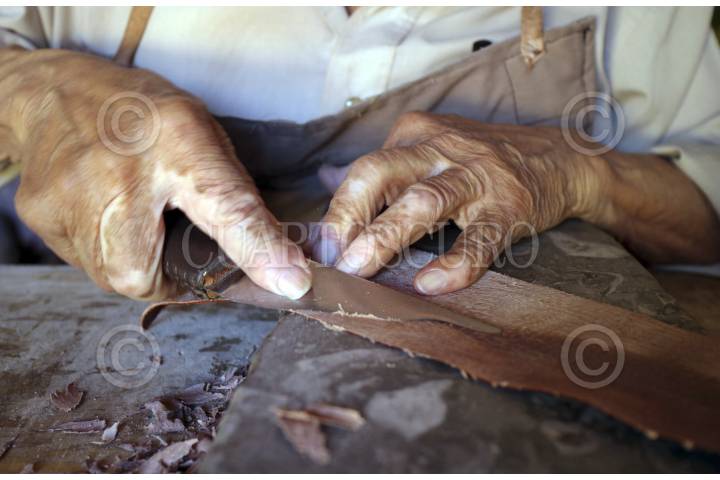 EL MARQUÉS, QUERÉTARO, 17OCTUBRE2010.- La comunidad de San Vicente Ferrer mantiene su economía gracias a la venta del trabajo de la tradición familiar de la talabartería. En la actualidad existen mas de treinta talleres para la fabricación de cinturones, carteras y bolsos para dama de piel genuina. Aunque las importaciones provenientes de China y la fabricación en vinipiel han mermado el mercado y están compitiendo deslealmente; la calidad que ofrecen continúa siendo la de mayor demanda tanto por el público que asiste los fines de semana a la comunidad o de los pedidos que se surten a estados del norte del país o del bajío como Guanajuato. Esta tradición la iniciaron los hermanos José y Lucio Briones Valencia hace mas de treinta años. En la actualidad algunos de sus sobrinos como José Molina Briones y excolaboradores de los talleres continúan la tradición. En la imagen José Molina Briones artesano talabartero. FOTO: DEMIAN CHÁVEZ/CUARTOSCURO.COM