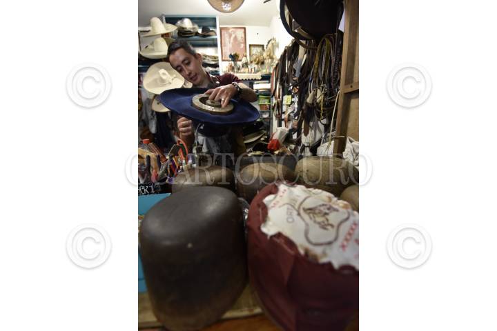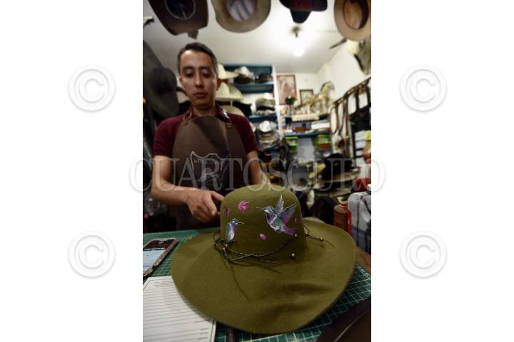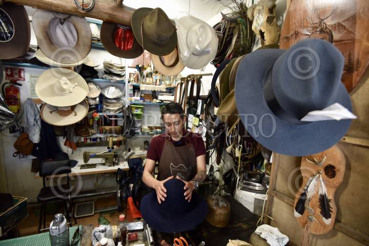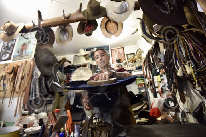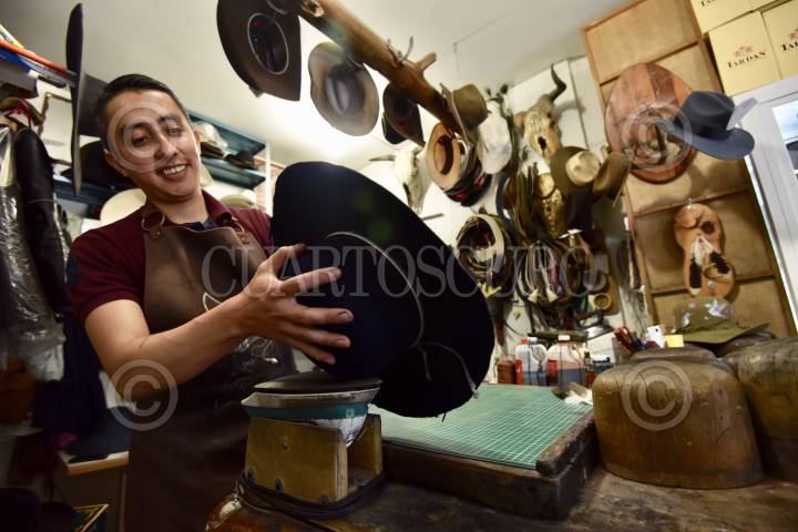 TOLUCA, ESTADO DE MÉXICO, 01ABRIL2019.- La Sombrerería y Talabartería El Texano con una tradición de más de 125 años hace sombreros a la medida y gusto de sus clientes, Rodrigo García Guerrero, continúa con el negocio que aprendió de su abuelo, padre y tíos, y actualmente busca innovar en el diseño de los sombreros, que nunca pasan de moda, y tiene diseños exclusivos los cuales tienen pintura al óleo y al gusto del cliente, el tiempo para elaborar un sombrero llega a ser de más de 10 horas, ya que todo es de forma artesanal y trabaja diversos materiales como lana de borrego, pelo de nutria, pelo de castor, piel de conejo, entre otras y los previos oscilan desde los mil pesos hasta treinta mil pesos; sus sombreros han llegado a países como Estados Unidos, Canadá, Japón y Australia. FOTO: ARTEMIO GUERRA BAZ /CUARTOSCURO.COM