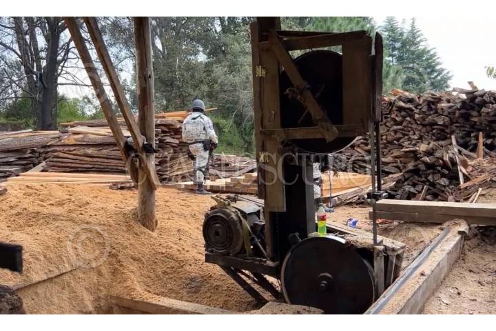 HUITZILAC, MORELOS, 05SEPTIEMBRE2023.-Dos aserraderos clandestinos fueron asegurados en un operativo del Ejército Mexicano en coordinación con la Guardia Nacional y la Fiscalía General de la República en el barrio de San José. El operativo inicio alrededor de las 12:20 horas, las autoridades ubicaron los predios que eran utilizados para esta actividad; los talamontes que estaban en la propiedad al ver la presencia militar huyeron. En un predio se aseguraron 80 metros de madera aproximadamente, 200 troncos y maquinaria como una torre de acero con motor trifásico y un carro de empuje, en el otro predio había troncos y madera trabajada. Desde el 2 de agosto a la fecha ya suman 17 aserraderos decomisados en este municipio del norte del estado. FOTO: ESPECIAL / CUARTOSCURO.COM