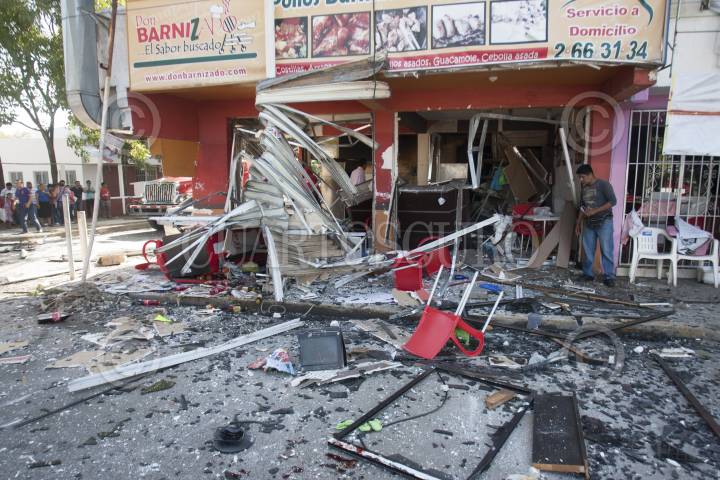 VILLAHERMOSA, TABASCO, 14FEBRERO2014.- Distintos daños en el inmueble fueron registrados cuando las ondas expansivas detono la explosión al interior de la pollería Don Barniz que se ubica en el malecón Leandro Rovirosa Wade esquina Paco Solis de la populosa colonia Gaviotas Nortes. El siniestro también alcanzo a unidades motrices, y aviento a varios metros de distancia pedazos de vidrios sillas y lamina de la cortina. FOTO: MARCO POLO GUZMÁN HERNÁNDEZ /CUARTOSCURO.COM