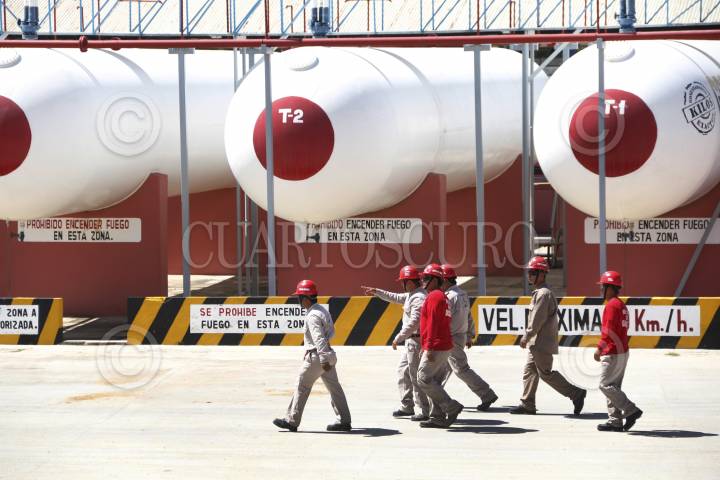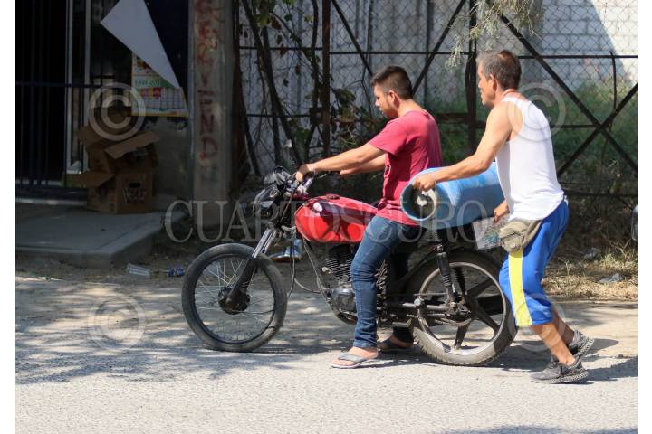 Dos hombres llevan un tanque de gas para ser llenado en una estación de servicio, en Jojutla.
